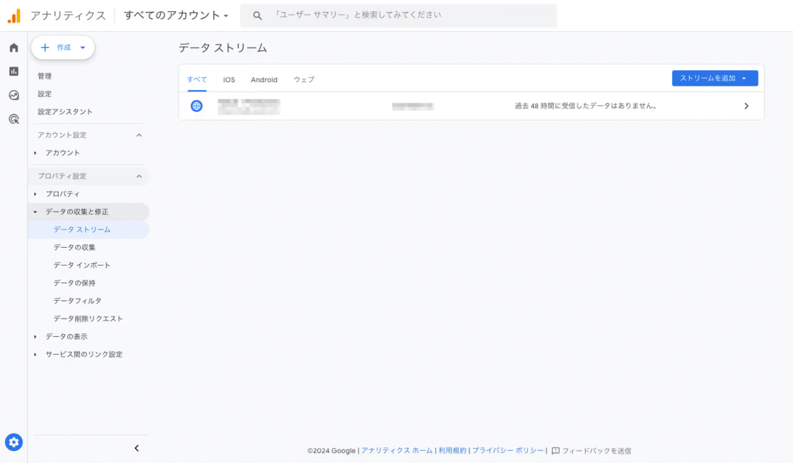 左下の歯車アイコンを押し、[プロパティ設定] > [データの収集と修正] > [データストリーム]から確認できます。