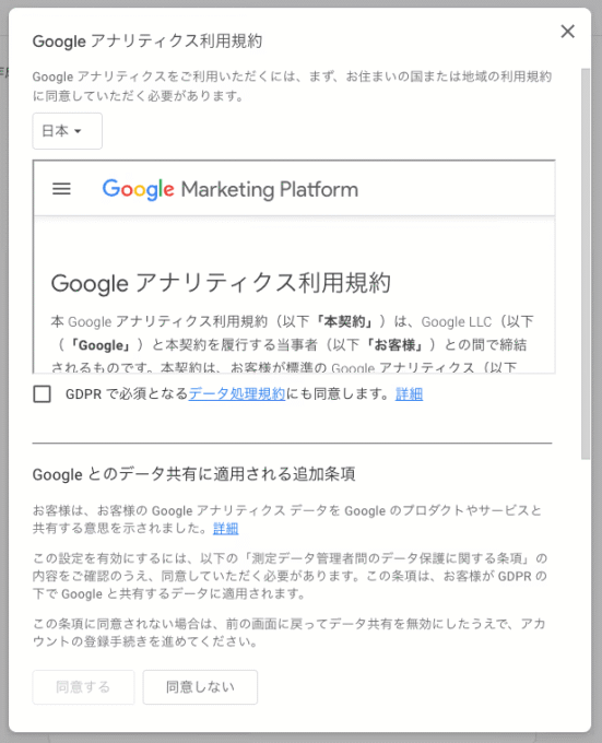 内容に問題なければ2箇所にチェックを入れて[同意する]を押すとGoogle アナリティクスのアカウントの開設が完了します。