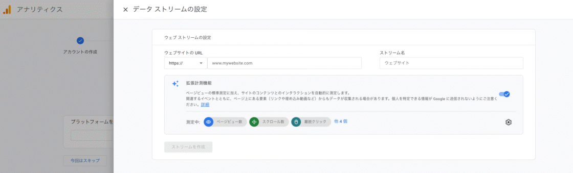 [ウェブサイトの URL]に計測するWebサイトのURLを入力し、[ストリーム名]は計測するWebサイトの名前を入力します。