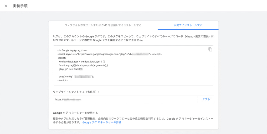 [実装手順]の[手動でインストールする]のタブを選択し、表示されたソースコードをすべてのページの<head>要素の直後に設置してください。